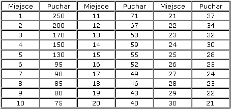 2. Zwycięzcą klasyfikacji generalnej Pucharu Polski zostanie zawodnik, który zgromadzi łącznie największą ilość punktów uzyskanych we wszystkich edycjach pucharu. 3. W przypadku uzyskania równej liczby punktów przez dwóch lub więcej zawodników, o zwycięstwie w klasyfikacji generalnej decyduje wyższe miejsce uzyskane w ostatnim wyścigu, po którym będzie ogłoszona klasyfikacja generalna. 4. Po każdym pucharowym wyścigu wyłoniony zostanie lider tj. zawodnik posiadający łącznie największą ilość punktów uzyskanych w kolejnych wyścigach. 5. W przypadku uzyskania tej samej liczby punktów przez dwóch lub więcej zawodników liderem zostaje zawodnik, który zajmie wyższe miejsce w ostatnim klasyfikowanym wyścigu. VIII. NAGRODY 1. Organizator przewidział cenne nagrody rzeczowe i trofea sportowe wręczane po każdej edycji. 2. Zwycięzca Pucharu Polski otrzyma ręcznie wykonany kryształowy puchar. 3. Trzech najlepszych zawodników ma obowiązek uczestniczenia w ceremonii dekoracji bezpośrednio po zakończeniu biegu finałowego. IX. KARY Komisja Sędziowska w porozumieniu z Organizatorem może zasądzić następujące kary: 1. Upomnienie. 2. Kara finansowa w wysokości min. 100 ZŁ 3. Dyskwalifikacja. 4. Zawieszenie. X. WPISOWE 1. Koszt uczestnictwa w zawodach wynosi 20 ZŁ. XI. POSTANOWIENIA KOŃCOWE. 1. Organizator nie ponosi odpowiedzialności za wypadki losowe zaistniałe podczas dojazdu uczestników na zawody i powrotu z nich. 2. Każdy uczestnik bierze udział w zawodach na własną odpowiedzialność. 3. Organizator zapewnia wszystkim zawodnikom biorącym udział w zawodach niezbędną opiekę medyczną na czas trwania zawodów. 4. Organizator nie ponosi odpowiedzialności materialnej za rzeczy zaginione w trakcie trwania zawodów. 5. Organizator nie ponosi odpowiedzialności za ewentualne kolizje i wypadki na trasie. 6. Brak znajomości regulaminu nie będzie uznawany jako wytłumaczenie. 7. Zawodnik obowiązany jest do odpowiedniego ubezpieczenia się od następstw nieszczęśliwych wypadków jak i od odpowiedzialności cywilnej. Organizator |