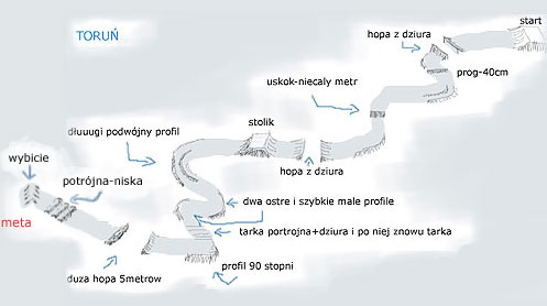 Zaraz po przyjeździe składamy sprzęty, a wizja lokalna toru ujawnia niuansiki: - tor został troszkę ulepszony, Pierniki postarały się i podniosły dwa uskoki do wysokości około metra, - wspólnie ze strażakami wykarczowano sporą część krzaków w dolnym odcinku traski, co pozwoliło obserwować przejazdy w znacznie szerszym zakresie